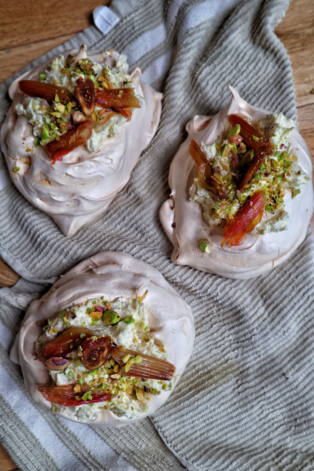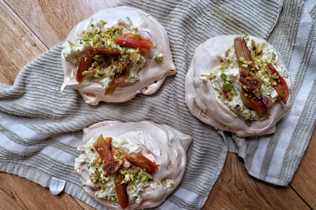 🧁🍒🍑🍭- Meringue nest with rhubarb cream, garnished with rhubarb , crushed pistachios & figs 🍇🍉🍪🍧
